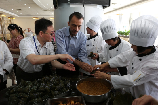 5月27日,由校工会主办、后勤实业发展中心承办的“粽”爱端午——2017年端午佳节活动在我校第二餐厅举办。校工会常务副主席柳如荣代表学校向教职工们致以节日的问候和祝福。后发中心准备了美味粽子和制作粽子的材料,让大家亲身体验了包粽子的乐趣,还准备了精美的空香包和不同功效的香草,供大家制作自己喜欢的端午香囊。活动中,弥漫着节日的气氛,充盈着端午的欢愉,在现场参加活动的老师跃跃欲试,外教老师们也参与进来,通过现场的工作人员手把手教学,一个个模样可爱的粽子出现在老师们的手中。在制作香囊的体验区,教师们根据不同香料的作用,配置出不同功效、不同味道的的香囊。活动现场气氛热烈,教职工们不亦乐乎。
