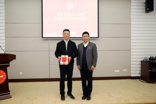 校党委常委、组织部部长朱洪春向徐军同志赠送《中国共产党历史》《论共产党员的修养》《信仰·党员学习手册》等红色书籍。