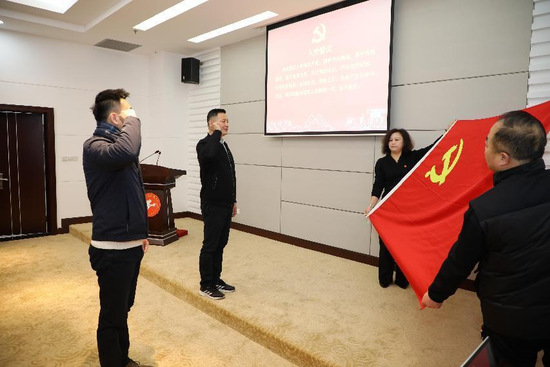 新党员徐军同志在党支部书记高丹的带领下,面向党旗举起右拳,庄严宣誓。宣誓完毕后,徐军同志作表态发言,他表示将以党员标准严格要求自己,加强学习,努力工作,将自己融入到全心全意为人民服务的工作当中,用实际行动践行自己今天的誓言,努力向一名优秀共产党员看齐。