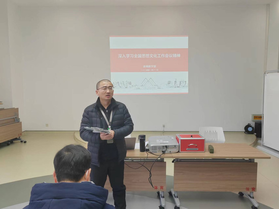 体育教学部党总支书记李扬传达了学校宣传思想文化工作会议暨师德师风建设工作会议精神,结合校领导提出的工作要求,希望体育教学部聚焦民族传统体育,弘扬中华体育精神,重视民族传统体育“八段锦”、舞龙等项目,打造人人都会“八段锦”的学校体育特色文化,将民族传统体育文化融入课堂教学内容,发挥民族传统体育文化育人功能。希望体育教学部全体教师必须树牢师德师风第一标准,以学生为中心,因材施教,尊重理解学生,平等对待学生,自觉抵制学术不端行为,努力成为师德师风典范“大先生”。