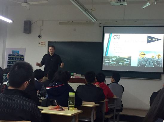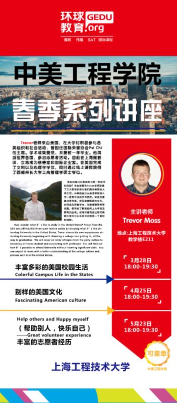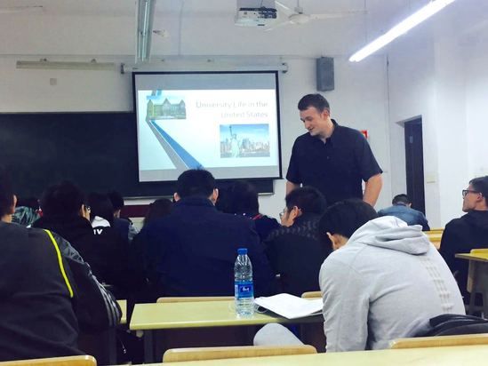 本学期开学伊始,中美工程学院就为中美学生及全校师生组织了每月一次的春季系列讲座,由来自美国主修文学艺术与心理学、以及MBA的年轻帅哥外教Trevor Moss主讲。报告内容3月为《丰富多彩的美国校园生活》(Colorful Campus Life in the States),4月为《别样的美国文化》(Fascinating American Culture),5月为《丰富的志愿者经历》(Great Volunteer Experience)。