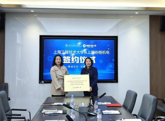虞蓉代表学院向上海协格机电科技股份有限公司授校企产学研合作基地牌。学院能源与动力工程系主任邓胜祥教授与张美玲进行校企合作签约。