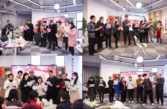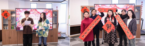 学院党政为老师们送上了“福”和新春对联。各系室尽展才华,带来精彩纷呈的欢庆节目:电气工程系《真心英雄》、学生工作办公室《当》、自动化系《恋曲1990》、跨系室组合《直到世界尽头》、计算机系歌曲串烧等合唱节目,计算中心《七里香》、自动化系《我是一只小小鸟》等独唱,党政办《莎士比亚 Sonnet 18》古英语朗诵、计算中心集体朗诵、古装剧《宁安如梦》配音等语言类节目,也有口琴独奏的乐器演奏类节目。外籍教师安东尼用三国语言祝福老师们在新的一年里工作顺利,阖家幸福。