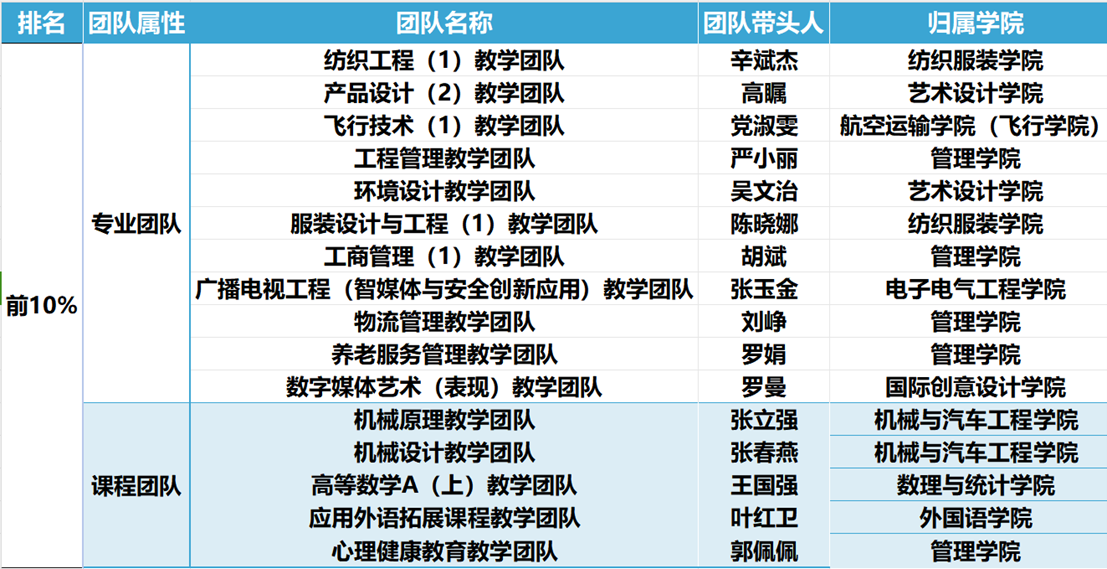 为进一步学习贯彻党的二十大精神,落实《关于深入推进本科教学教师激励计划的指导意见》(沪教委高〔2017〕64号)文件要求,聚焦培养可持续发展的教师队伍,激励全体教师全身心投入教学工作,扎实推进本科教育教学改革和基层教学组织建设,学校从教学开展情况、教育教学改革情况、本科生培养情况等方面对108个专业教学团队、52个课程教学团队进行了年度考核。经考核,共有11个专业教学团队、5个课程教学团队排名前10%。