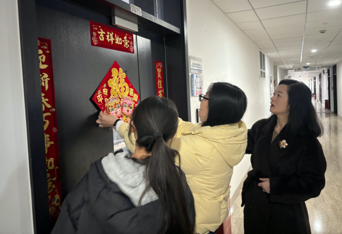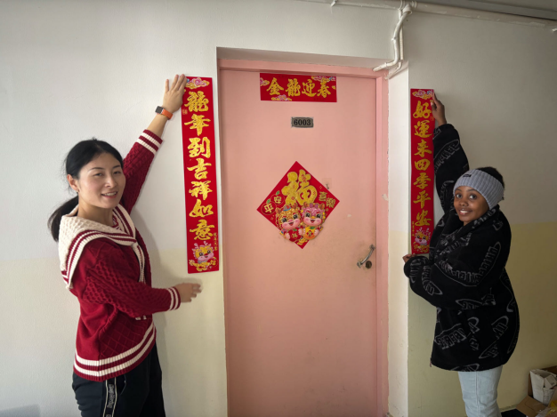 赵梦影老师与辅导员们还一同走访了宿舍园区,慰问留校学生。走访过程中,聚焦冬季安全防范要求,对寒假期间学生宿舍生活用电安全进行了排查和安全知识宣讲,希望同学们在校园里过个平安年。在留学生宿舍里,与同学们一起贴中国传统的春联和窗花。来自各国的留学生们还向大家讲述了自己国家的新年文化。赵梦影强调,学院将一如既往地关心关爱每一位学生,为大家提供更好的学习和生活环境,共同创造更加美好的未来。
