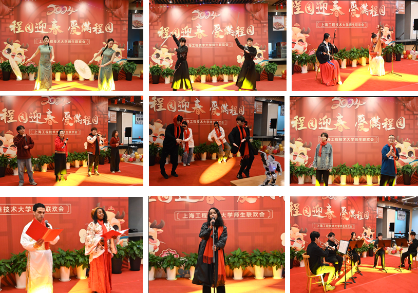 在温馨、欢乐的气氛中,校领导与留校师生共品“品味八大菜系、享游华夏九州”的新春宴席,共赏《国韵芳华》古典舞、《龙猫组曲》铜管重奏、留学生诗文朗诵和歌曲串烧、抽奖游戏等形式多样的节目,由机器人和留校师生共舞的《科目三》将现场氛围推向高潮。师生沉浸式地尽享了一场有思想内涵、有科技趣味、有人文情怀的“上工程春晚”。