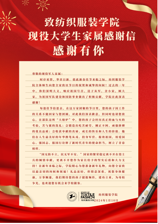 纺织服装学院十分重视入伍学生在部队的发展,时刻关心服役学生的家庭状况,学院对9名在役学生的家属进行了电话慰问,关心关爱其生活和家庭情况,并在春节来临之际向入伍学生家属寄出慰问信和节日慰问品,送去学校和学院的温暖和爱护,在役学生家属纷纷对于学院的关心表达了衷心的感谢。