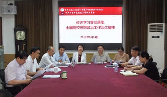 6月14日下午,高职学院党委在综合楼811会议室召开会议传达学习贯彻落实全国思想政治工作会议精神。学院党委中心组全体成员参加了此次学习,会议由学院党委书记沈海庆主持。