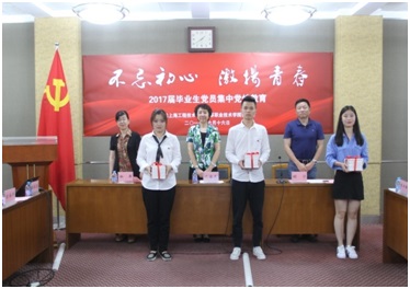 学院党委书记、院长与学院组织科长徐萍老师为毕业生党员赠送党性教育读本提醒着同学们坚持学习,不忘初心,牢记使命。