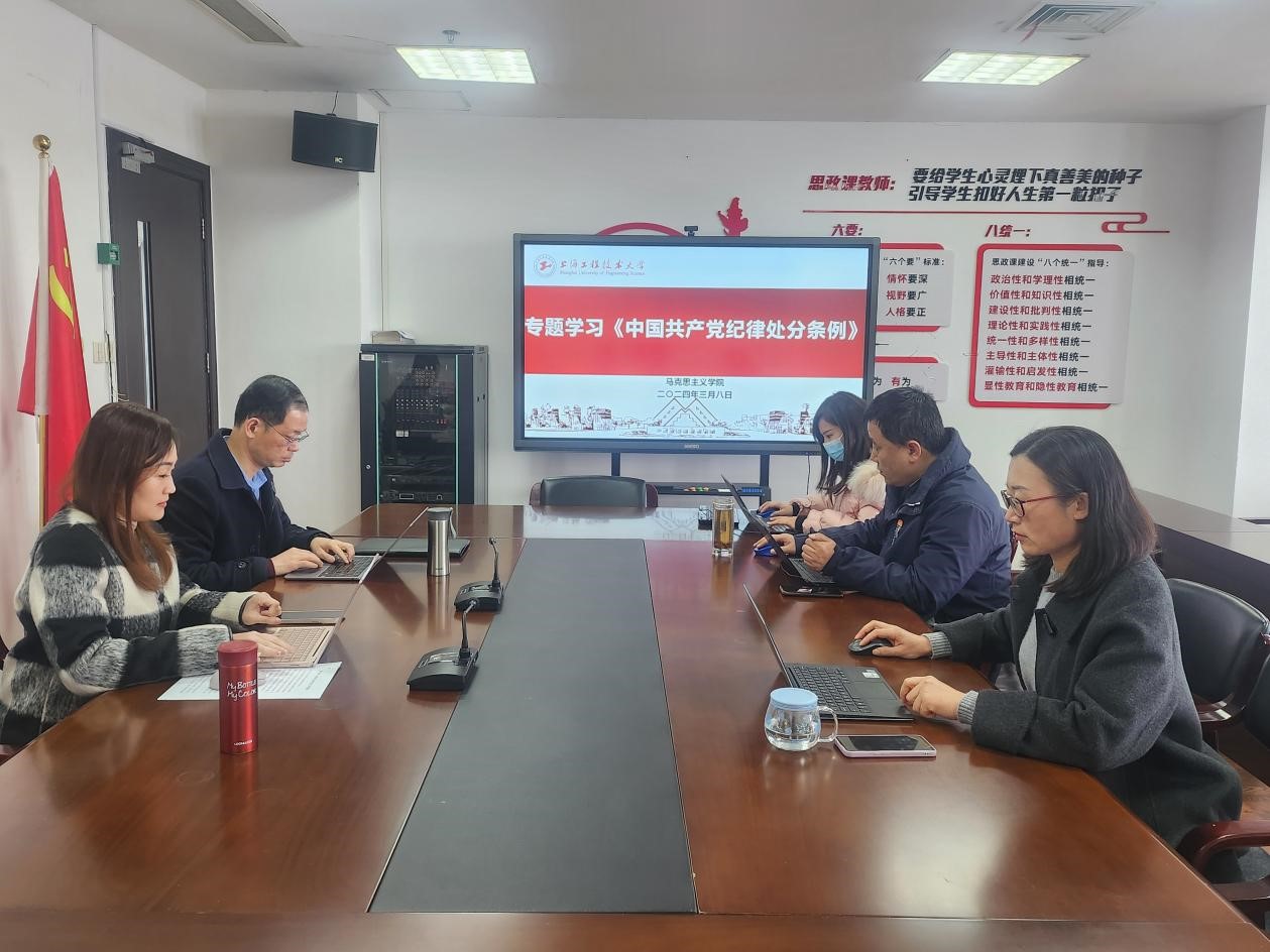 3月8日上午,马克思主义学院党委在行政楼1112室召开理论学习中心组学习会,专题学习《中国共产党纪律处分条例》,学院党委委员、组织员、宣传员、纪检员参加学习,会议由学院党委书记董旖旎主持。