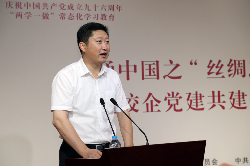 6月27日,校党委与上海纺织集团党委在长宁校区举行校企共建党建基地揭牌仪式,上海纺织集团党委书记童继生和校党委书记李江共同为服装学院党委与上海市纺织科学研究院有限公司党委共建的党建基地揭牌。童继生书记还受邀为师生上了一堂主题为“交通中国之‘丝绸之路’”的思政课,为我校交通中国系列思政课程增添了精彩一课。
