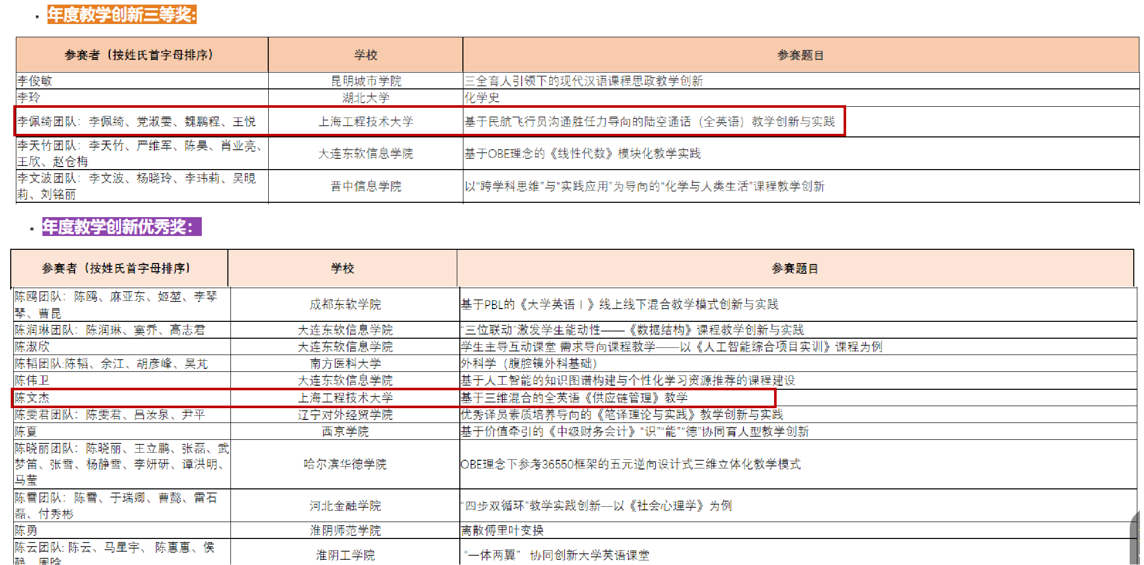 近日,从第九届西浦全国大学教学创新大赛决赛官网获悉,航空运输学院(飞行学院)李佩绮老师团队的《陆空通话(全英语)》课程在第九届西浦全国大学教学创新大赛中荣获三等奖;城市轨道交通学院陈文杰老师团队的《基于三维混合的全英语<供应链管理>教学》荣获第九届西浦全国大学教学创新大赛年度教学创新优秀奖,这是我校教师首次参赛并获奖。