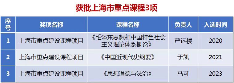 2021年秋季学期起,“习近平新时代中国特色社会主义思想概论”课程纳入本科生培养方案,“四史”类思政教育课程也同步进入学生培养计划,在全校本科生中实现了全覆盖。五年间, 思政课程建设获得实效,3门思政课获批上海市级重点课程。