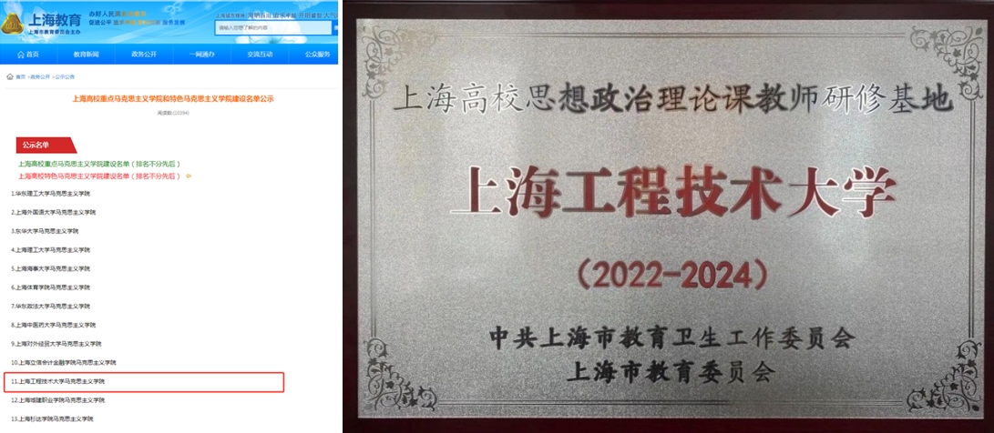 在学校党委领导下,马克思主义学院努力落实“思想政治理论课作为重点课程、马克思主义理论学科作为重点学科、马克思主义学院作为重点学院”的工作要求,获批上海高校特色马院。马克思主义理论学科在软科中国马学科排名第123名,在上海市属高校中排名第3名。学校获批上海高校思想政治理论课教师研修基地,成立上海工程技术大学中共党史党建研究院。