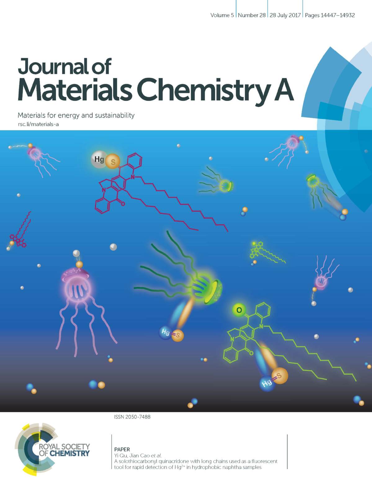 近日,我校化学化工学院荧光功能材料课题组瞿祎博士、曹俭副教授等人在石油化工产品中的有害重金属监测领域取得重要突破,研究成果在英国皇家化学会能源与环境领域国际知名杂志《Journal of Materials Chemistry A》(影响因子8.867)上以“A solothiocarbonyl quinacridone with long chains used as a fluorescent tool for rapid detection of Hg2+ in hydrophobic naphtha samples”为题发表,并受邀入选该杂志封面文章(Outside Front Cover)。