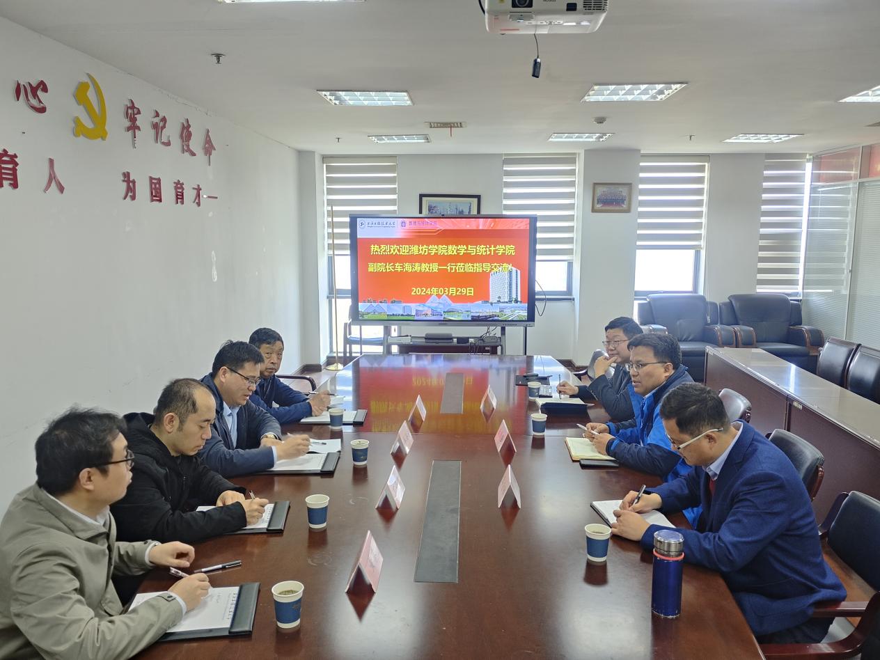3月29日上午,潍坊学院数学与统计学院副院长车海涛,张福祥教授等一行来校调研交流。数理与统计学院院长王国强,副院长吴建宝,李宜阳教授参加调研交流会。