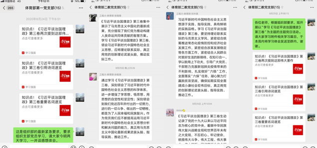 《习近平谈治国理政》第三卷出版以来,在体育教学部广大党员群众中掀起了学习热潮,部门党总支以不同形式多次组织党员群众学习。此前,在8月底,体育教学部第一、第二党支部组织党员开展线上主题党日学习,专题学习《习近平谈治国理政》第三卷。下阶段,将由党总支书记王振钧为全体党员上党课,专题聚焦《习近平谈治国理政》第三卷。通过学习,使党员、干部和群众们学懂弄通做实习近平新时代中国特色社会主义思想,系统掌握贯穿其中的马克思主义立场观点方法,增强“四个意识”、坚定“四个自信”、做到“两个维护”,进一步更好地守初心、担使命。