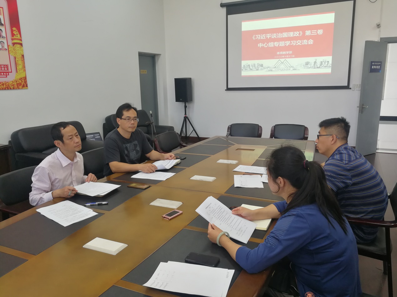 根据《上海工程技术大学关于认真组织学习〈习近平谈治国理政〉第三卷的通知》精神,近日,体育教学部党总支在体育馆201会议室召开《习近平谈治国理政》第三卷中心组专题学习交流会。