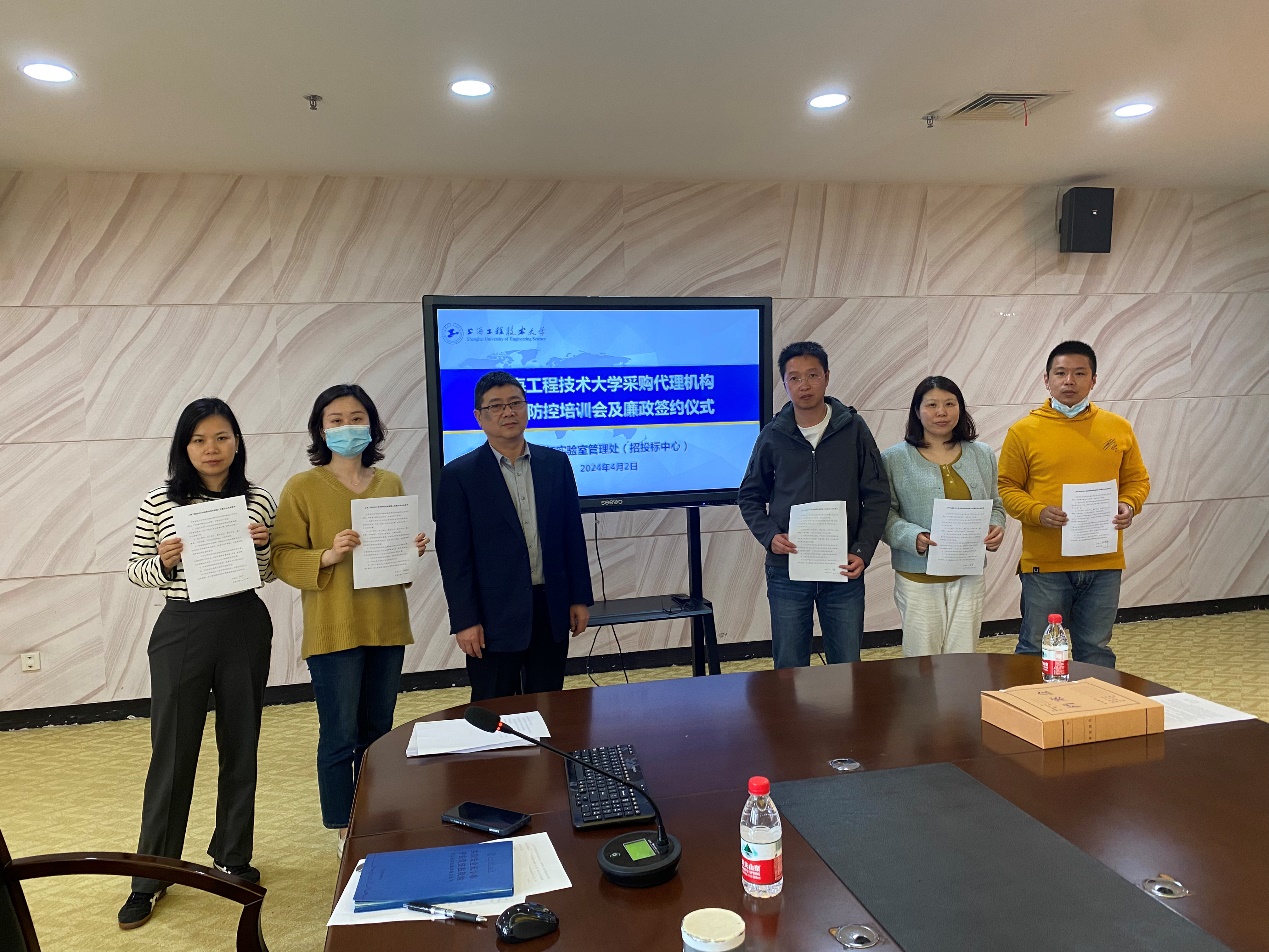 会上举行了廉政责任签约仪式。招投标中心工作人员和各代理机构分别签订了《廉洁从业承诺书》,承诺将依法依规,以高度的责任感和精湛的业务水平完成学校各项招标采购活动。