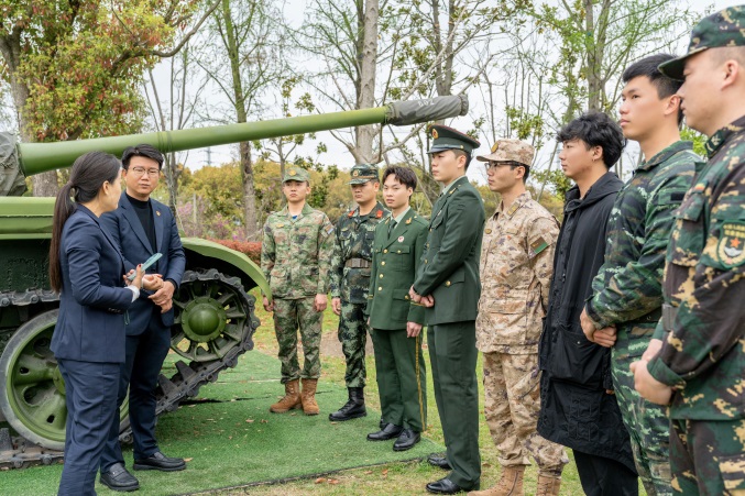 国防教育园里,同学们围绕着坦克、火炮等装备模型,聆听退役军人大学生党支部成员、松江烈士陵园讲解员梁一冰同学声情并茂地讲解这些武器背后的故事。同学们更加真切地了解了革命岁月的艰辛与祖国的强大,坚定了在强国建设、民族复兴的历史潮流中确立正确的人生目标。