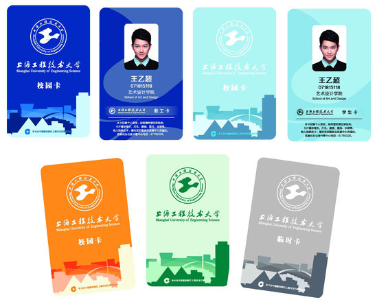 新版的校园卡色彩鲜明,富有设计感。版面设计是在艺术学院高瞩院长指导下,姚惠老师带领众多学生创作,择优而成。在校园卡文字规范翻译上,外国语学院给予大力支持。新版校园卡分不同角色共有5种,支撑新版校园卡各类应用的校园卡综合管理平台,以学校校园网为构建基础,是集身份识别、校内消费、校务管理、金融服务为一体的新型数字化校园应用项目,是我校“智慧化校园”的重要组成部分。平台覆盖松江校区和长宁校区,平台建设以无线射频识别技术和IC卡技术为核心,以计算机网络和通信技术为手段,将校园内各项设施连接成为一个有机的整体,师生手持一张校园卡就能实现食堂就餐、购物消费、校园乘车、图书借阅、考勤管理、门禁管理、浴室水控、宿舍电控、机房上机、医疗服务、体锻测试、自助打印、停车管理、会议签到等各项活动。此外,平台将通过对设备的自动化管理,在校内实现教学资源数字化、数据传输网络化、用户终端智能化、结算管理集中化,为学校师生提供一个方便、舒适、高效的办公、教学、科研、学习及生活环境。