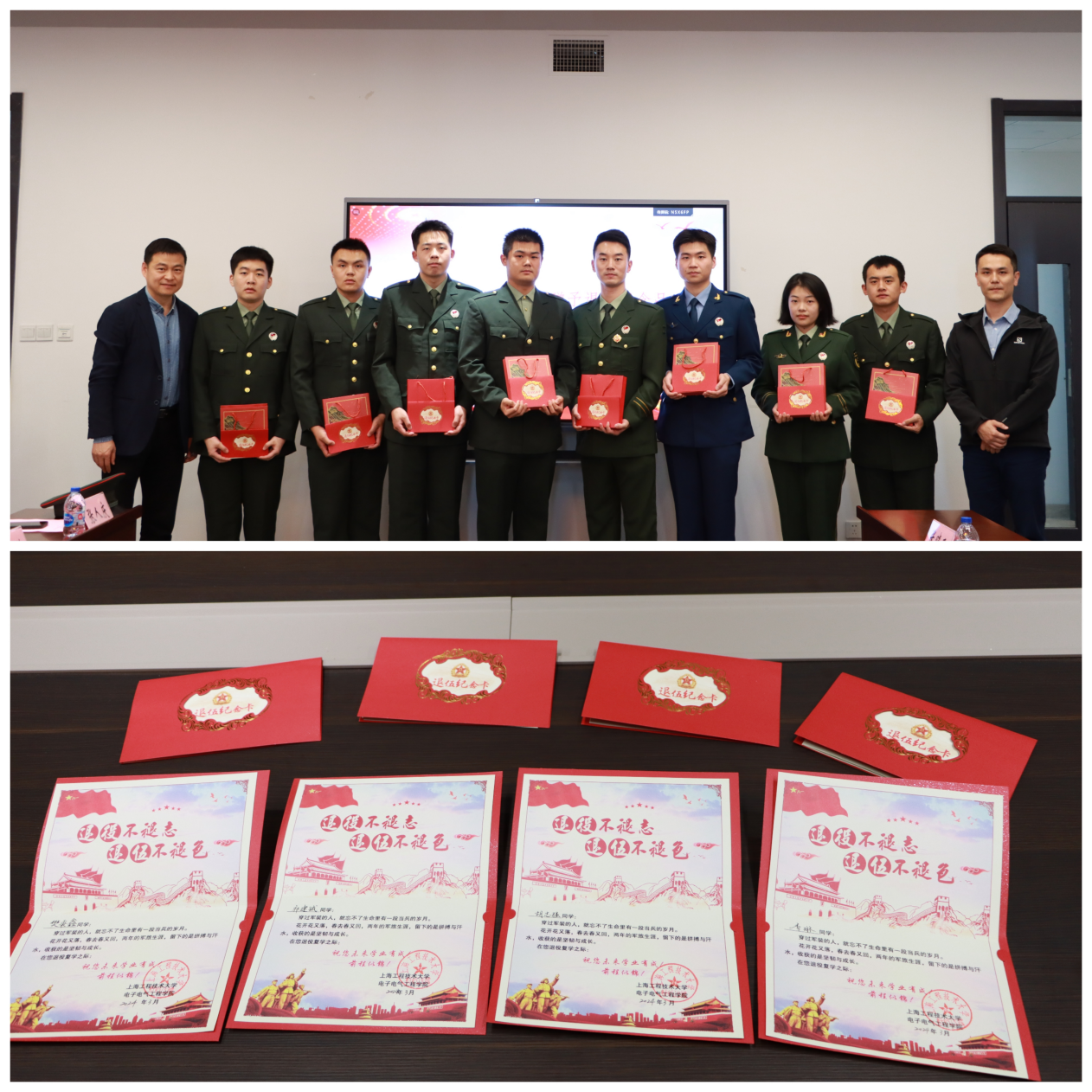 王东阳、陈磊为退伍学生颁发退伍纪念卡,赠予退伍纪念品。