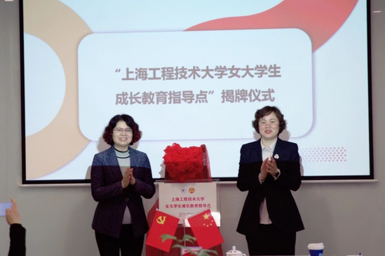 朱晓青感谢松江区妇联对大学城女大学生工作的高度重视以及对学校妇女工作的关心支持。希望进一步加强合作,共建“女大学生成长教育指导点”,为女大学生群体创设更多校园和家庭之外的成长空间,延伸学习场域,丰富实践体验。会上,朱晓青代表学校妇工委与松江区妇联张主席共同揭牌,上海工程技术大学首个“女大学生成长教育指导点”正式落户松江区妇联。