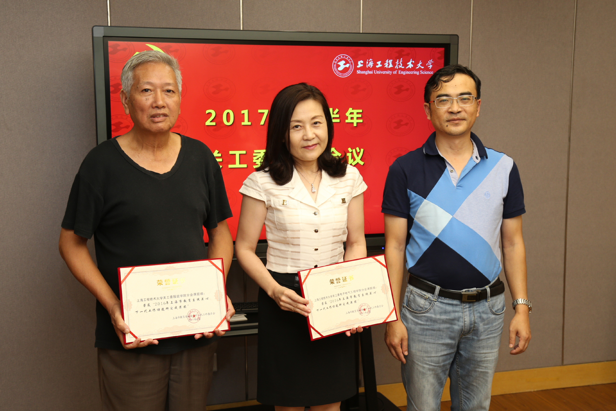 会上范永春副书记宣读了上海市教育系统关心下一代《关于授予2016年上海市教育系统关心下一代工作“课题研究成果奖”的决定》的通知,为我校获得关工委课题“成果奖”的服装学院关工委分会课题组和电子电气工程学院关工委分会颁发了证书。