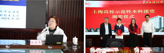副校长夏春明和教务处处长饶品华为2023学年度“上海高校示范性本科课堂”负责人金晓怡、李佩绮颁发荣誉证书。质量管理办公室(教师教学发展中心)主任匡江红介绍了学校2024年教学质量月的活动安排。