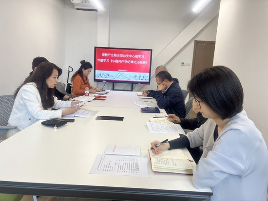 4月23日上午,继教产业联合党总支召开理论学习中心组学习会,专题学习《中国共产党纪律处分条例》,党总支理论学习中心组全体成员参加会议,会议由党总支书记袁蓉主持并领学。