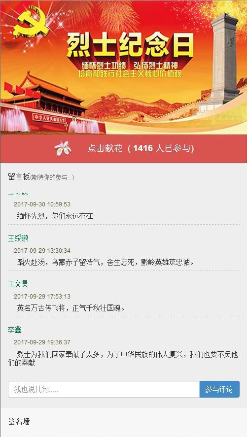 学生工作部(处)、研究生工作部同步在易班平台上开通了“缅怀烈士功绩,发扬烈士精神”的烈士纪念日专题活动版块,组织学生在线为烈士献花纪念。学生们积极响应,踊跃参与,已有2000余名学生在线向革命先烈献花和留言,表达了对烈士最崇高的敬意。