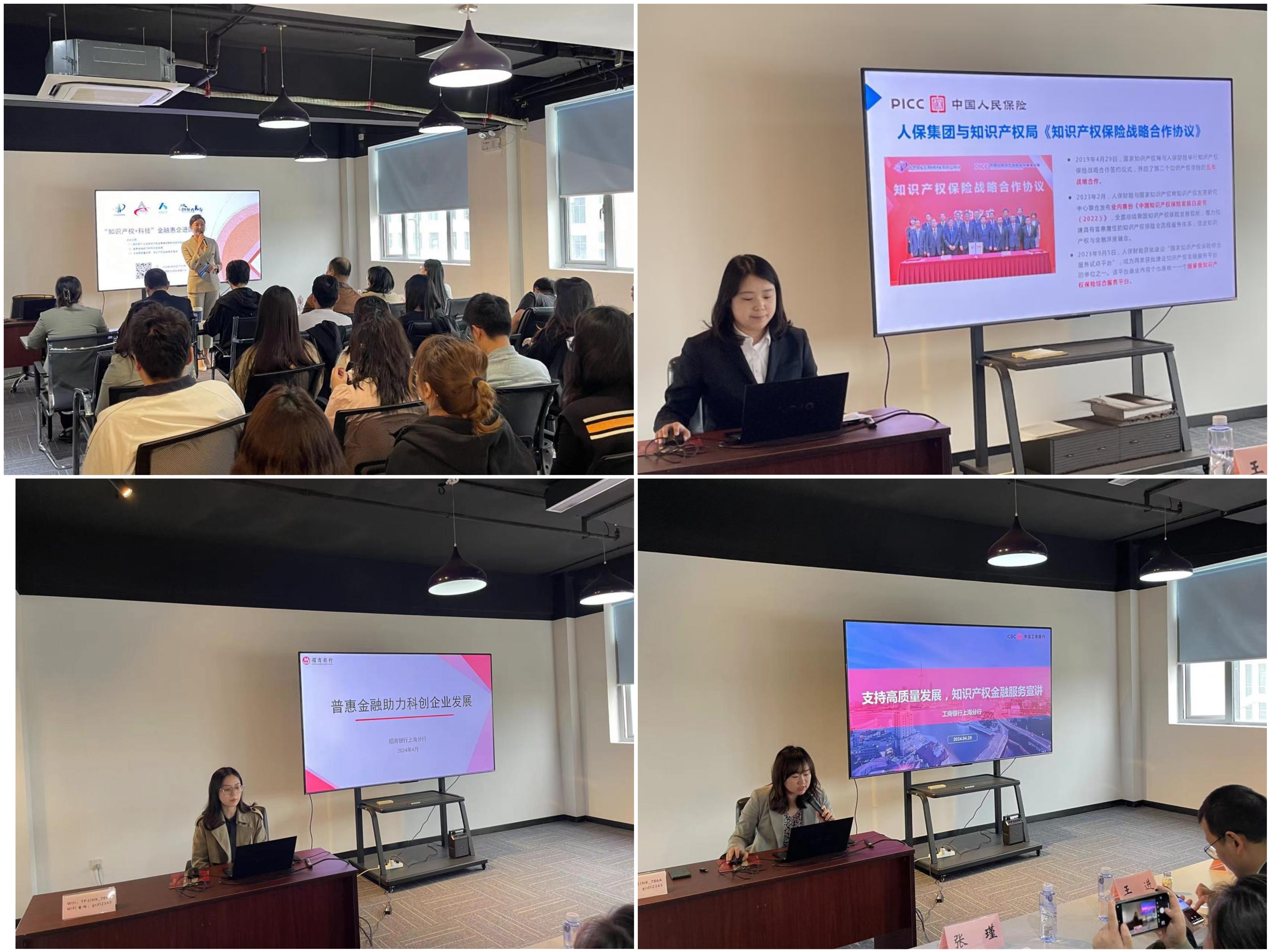 中国人民财产保险股份有限公司上海市分公司介绍了“新形势下企业知识产权运营痛点解析和应对举措”;招商银行上海分行为企业带来“普惠金融助力科创企业发展”;工商银行上海分行为企业带来 “支持高质量发展,知识产权金融服务宣讲”。