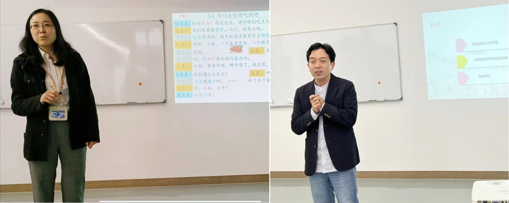 研讨会上,大家共同学习了“TBL任务型教学法”对任务的界定,将TBL教学法与传统的PPP教学法(即presentation-practice-product)进行对比,了解PPP教学法的局限性。高级班的韩老师和初级班的刘老师分别分享了他们基于TBL任务型教学法设计的教学任务。韩老师分享了她带领学生开展“人民公园相亲角”走访活动的任务。通过学生评估、目标评估和语言评估三个任务评估标准,反思了任务设计,提出了如何优化的策略。刘老师分享了自己在初级班设计的“点菜”的任务,该任务很好地模拟了真实的交际场景,贴近学生的生活,鼓励学生使用已有的词汇和语法知识解决问题,是非常有借鉴价值的任务。两位老师分享了自己的教学经验后,全体教师分组讨论了自己对班级语言实践活动的评估与反思。