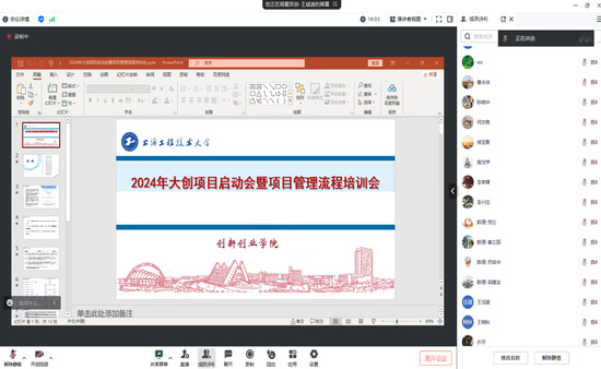 为进一步深化大学生创新创业教育改革与创新,推进完善我校大学生创新创业教育工作体系,规范大学生创新训练计划项目实施,4月29日中午,创新创业学院组织召开了“2024年大学生创新训练计划项目启动会暨项目管理流程培训会”。创新创业学院副院长万军,各学院(部、中心)从事大创管理、指导工作的教师以及参与本年度大创项目的同学代表参加了本次会议,会议由创新创业学院王斌涛老师主持。