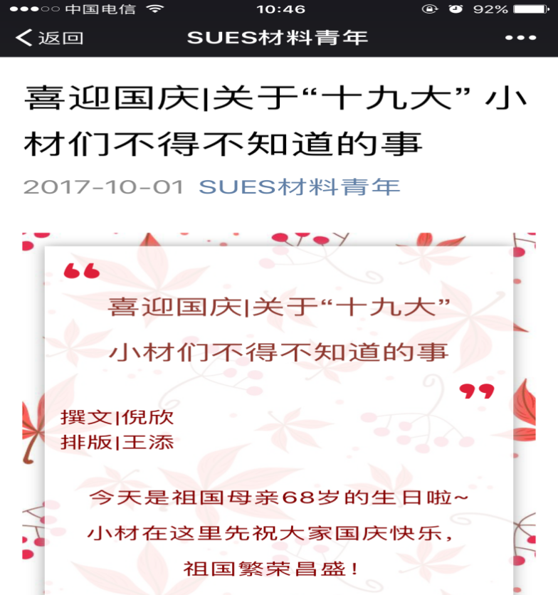为喜迎中国共产党第十九次全国代表大会胜利召开,深入贯彻习近平总书记系列重要讲话精神和党中央治国理政新理念、新思想、新战略,加强思想政治引领工作,培养学生爱党爱国情怀,材料工程学院开展“小材带你看十九大”系列主题活动。