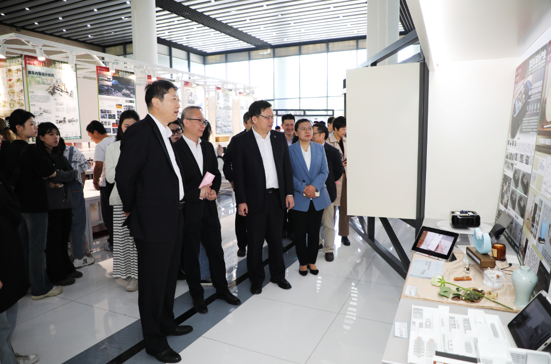 校党委书记李江宣布艺术设计学院2024届“设计·产业:中国式现代设计智慧”毕业设计作品展开幕。开幕式结束后,李江书记一行参观了毕业生作品展,并与现场师生进行了亲切交流,对学生毕业创作中所表现出的创新思维、实践能力、艺术思考、人文素养,给予了高度评价。