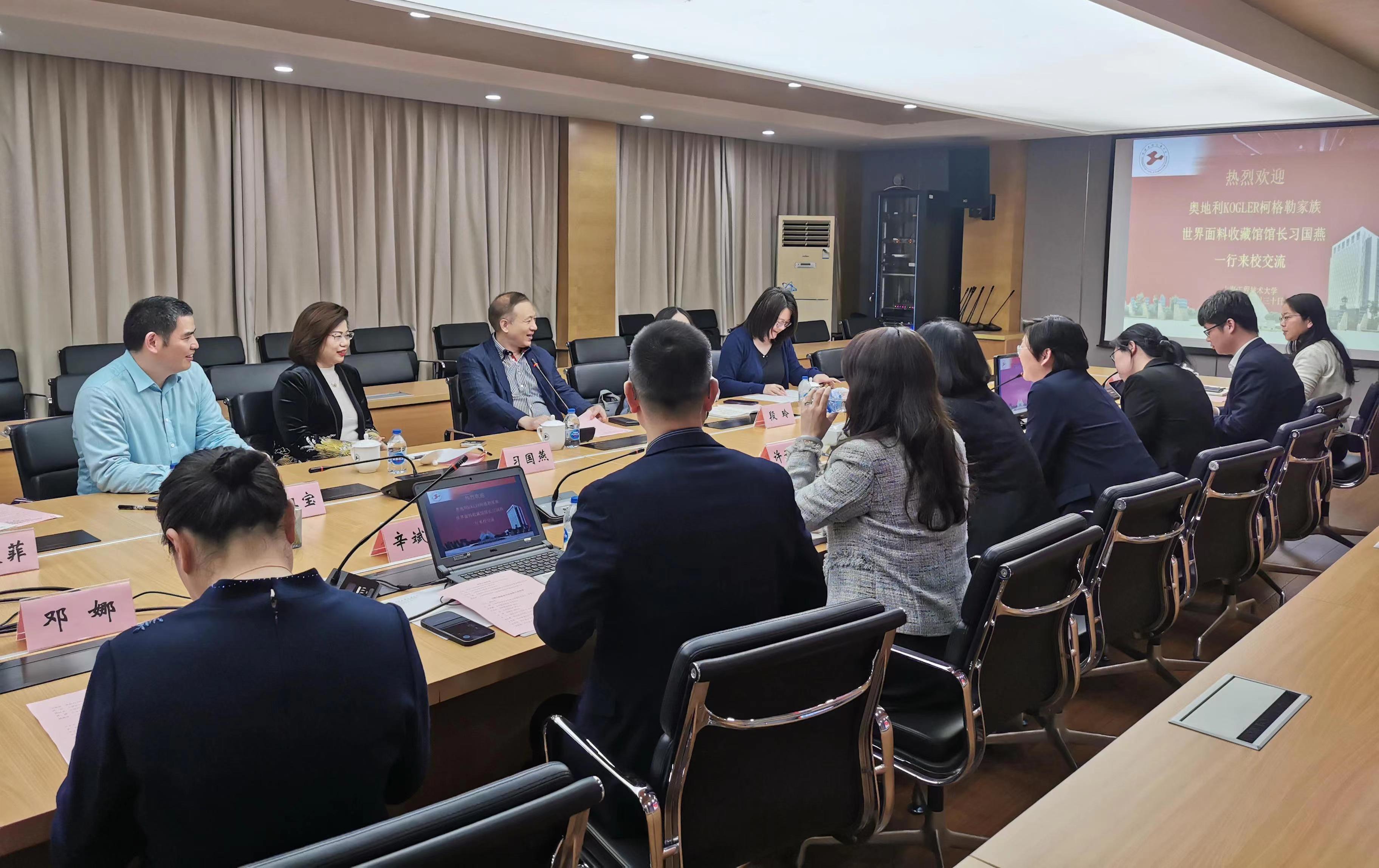 4月30日,奥地利KOGLER柯格勒家族世界面料收藏馆馆长习国燕一行访问纺织服装学院并洽谈合作。副校长许开宇致欢迎词并就双方合作内容进行了深入交谈与指导。纺织服装学院院长辛斌杰主持会议。上海纺织时尚产业发展有限公司党委书记、执行董事朱伟明及事业部副总经理陈健一行,上海纺织博物馆党支部书记段玲博士,校科技园发展有限公司法定代表人、董事长袁蓉,纺织服装学院党委书记朱君璇,发展规划处副处长冯洁,科研处副处长邓娜,国际合作与交流处副处长李丛以及学院党委副书记谢志霞,副院长李春晓、曲洪建等参加洽谈。