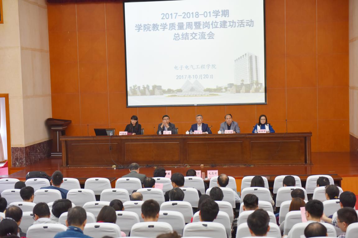 在党的十九大胜利召开之际,电子电气工程学院在院党委的领导下,开展了为期两周的教学质量周暨岗位建功系列活动,近期活动圆满结束并取得了预期效果。10月20日下午,学院在行政楼B301室召开活动总结会,副校长鲁嘉华、教务处处长方宇出席会议,学院党委书记陆展华、副书记秦颖,副院长李媛媛、史志才、刘瑾以及全院教师参加会议,会议由教学副院长李媛媛主持。