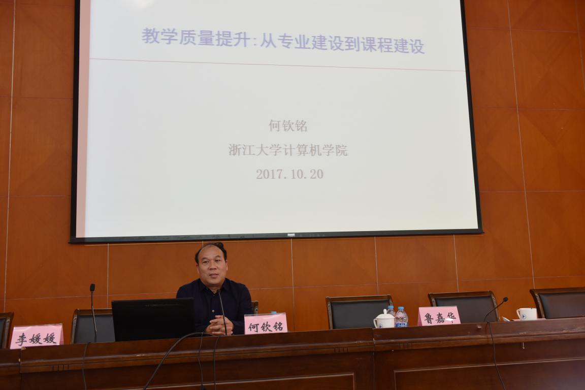 原浙江大学计算机学院党委书记何钦铭教授应邀作主题为“教学质量提升:从专业建设到课程建设”的报告。何教授以计算机学院的教学质量工程项目引出工程型、复合型、国际化的人才培养整体思路,通过国家级教学成果奖的申报内容提出专业建设的要点,同时通过高级数据结构与算法设计、高级语言程序设计两门课程解释如何提升课程建设质量,最后他分析了科研对教学的作用和贡献。何教授的报告深入浅出、引人入胜,引得大家报以阵阵掌声。