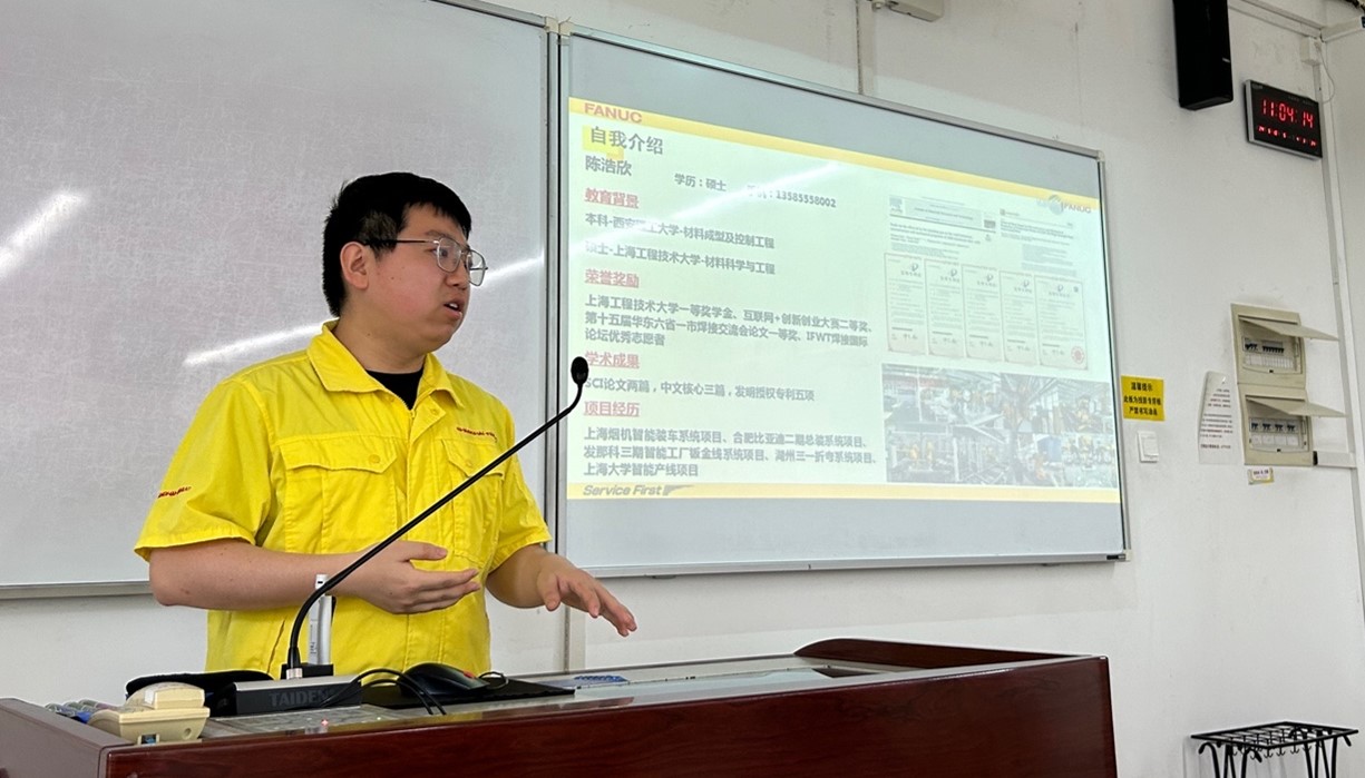 5月10号上午,材料科学与工程学院邀请上海发那科机器人有限公司技术经理陈浩欣走进《焊接过程测量与计算机控制》课堂,在教学楼D211为我校焊接工程与技术专业2021级本科生和部分研究生带来了一堂科技感满满的“发那科焊接机器人及其智能化应用”授课,让学生们更加深入地了解智能化焊接过程中各种传感器检测与计算机控制的重要性。