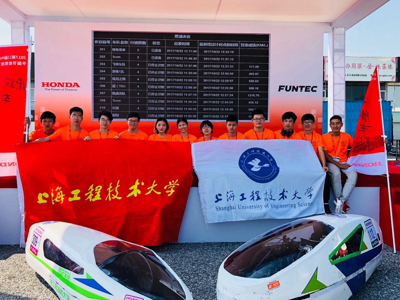 10月21日,第十一届HONDA中国节能竞技大赛以“挑战一升,节能一生”为主题,在广东国际赛车场盛大举行。经过正式比赛、专家现场评审等环节的激烈角逐,在指导老师及全体队员的共同努力下,我校汽车工程学院虎跃节能赛车队和龙腾节能赛车队分别荣获电动组第6名(全国共计45支参赛队)、燃油组第8名(全国共计66支参赛队)的好成绩,并因赛车的优秀设计和团队的技术实力,两支车队双双荣获大赛评委组颁发的“优秀车队奖”。