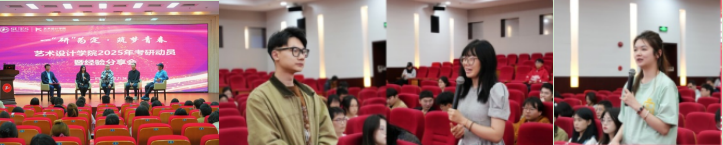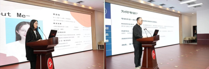 活动邀请2023届研考402分获得者、艺术设计学院2023级研究生黄洛伽学姐分享报考我校艺术设计学院的考研经验。邀请2024届本科毕业生、浙江大学软件学院2024年研考总排名第一、422分获得者席弘力分享外校考研经验。交流互动环节,同学们热情高涨,积极踊跃互动,两位考研优秀代表也以自身经验为例,聚焦备考重点,为同学们答疑解惑。