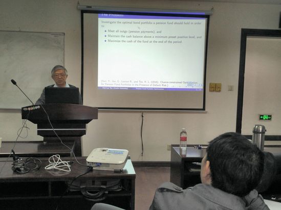 10月23日下午,澳大利亚科廷大学数学与统计系Kok Lay Teo(张国礼)教授应数理与统计学院邀请在行政楼1307报告厅为广大师生作题为“Chance-constrained Optimization for Pension Fund Portfolios in the Presence of Default Risk”的学术报告。参加讲座的有数理与统计学院、电子电气学院和管理学院等从事统计、优化和控制的教师及研究生。报告会由数理与统计学院李路副院长主持。