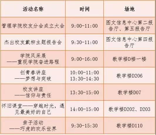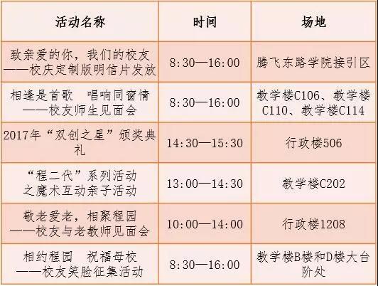 亲爱的校友们,您的母校将在10月28日(周六)迎来建校39周年校友返校日,活动内容精彩丰富,各类成果展览、“程二代”亲子体验活动、社团巡礼,还有各个学院为校友定制的各类活动,总有一款适合您。无论是好友相聚回首青春,还是家庭之旅亲子互动,“最美校园”等待您的到来。