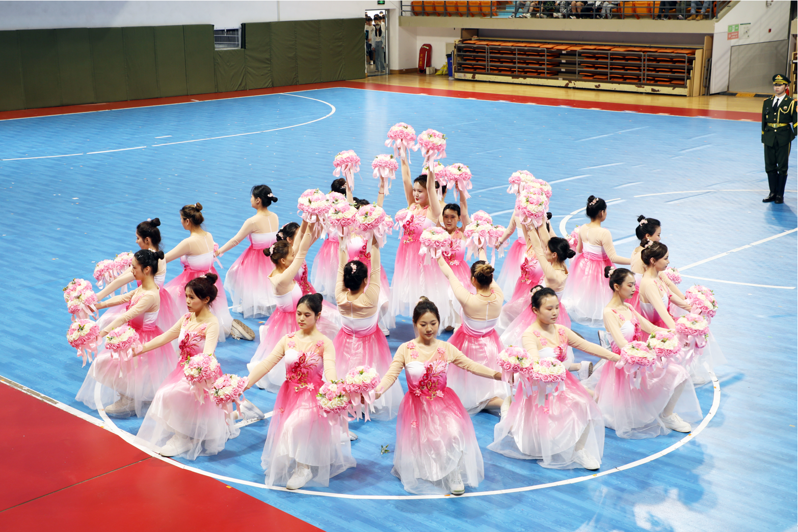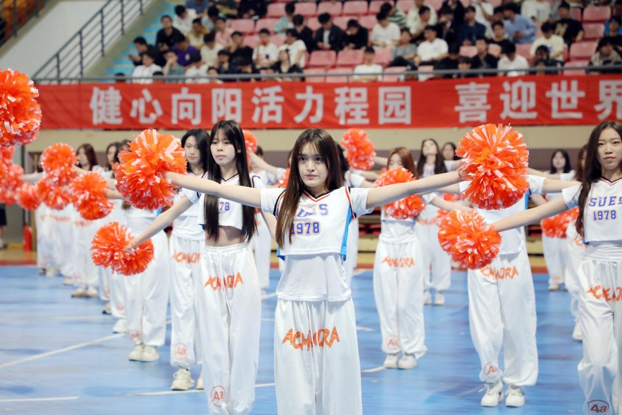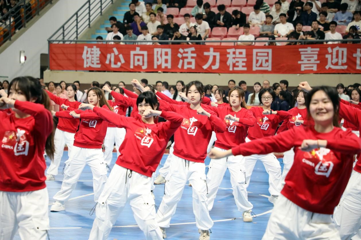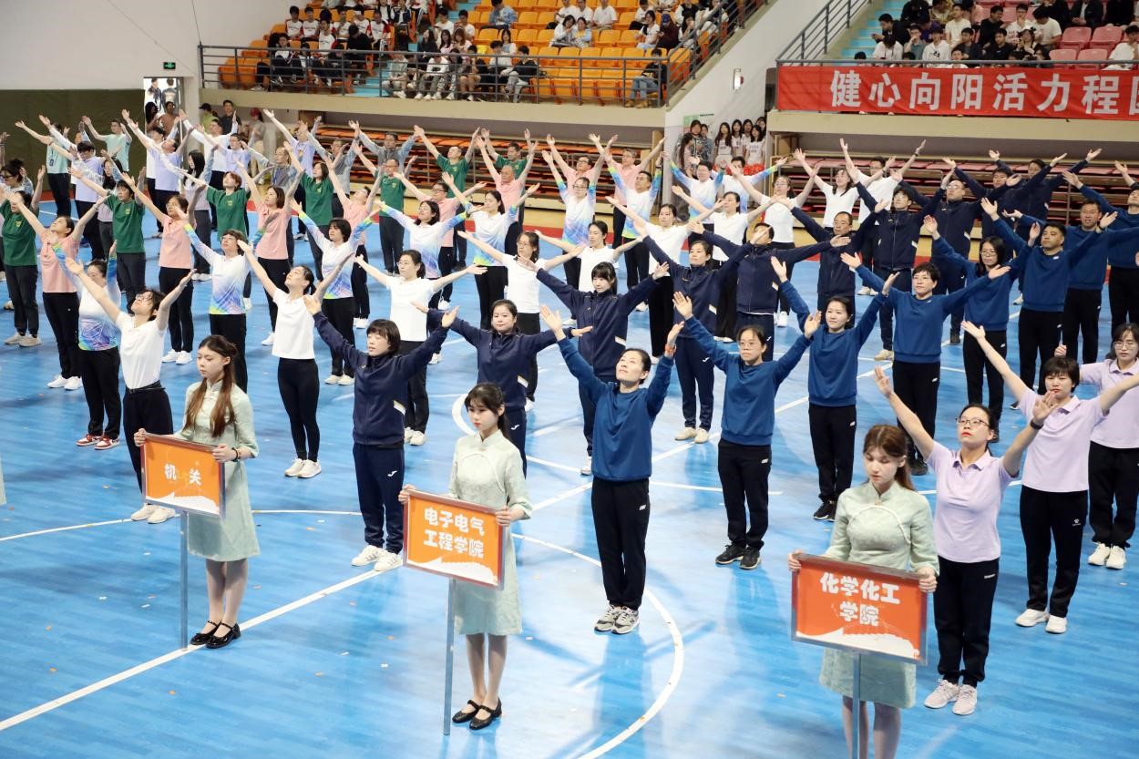 在开幕式体育节目展演环节,来自艺术体操公共体育课大学生表演的艺术体操节目《青花瓷》拉开了表演的序幕,她们以柔美而富有力量的动作,生动诠释青花瓷的精致与韵味,展现中国传统文化的独特魅力。排舞《我和我的国》,以精湛的舞技和优美的动作,深切表达对祖国的热爱与祝福。由各院系、部门的170名教职工带来广播体操表演,充分展现了学校全面贯彻落实全民健身国家战略,推进体育育人工作的成效。啦啦操专项班165名同学带来花球啦啦操表演,她们阵型变换迅速,花球随音乐舞动,用最青春的姿态书写对祖国的歌颂。