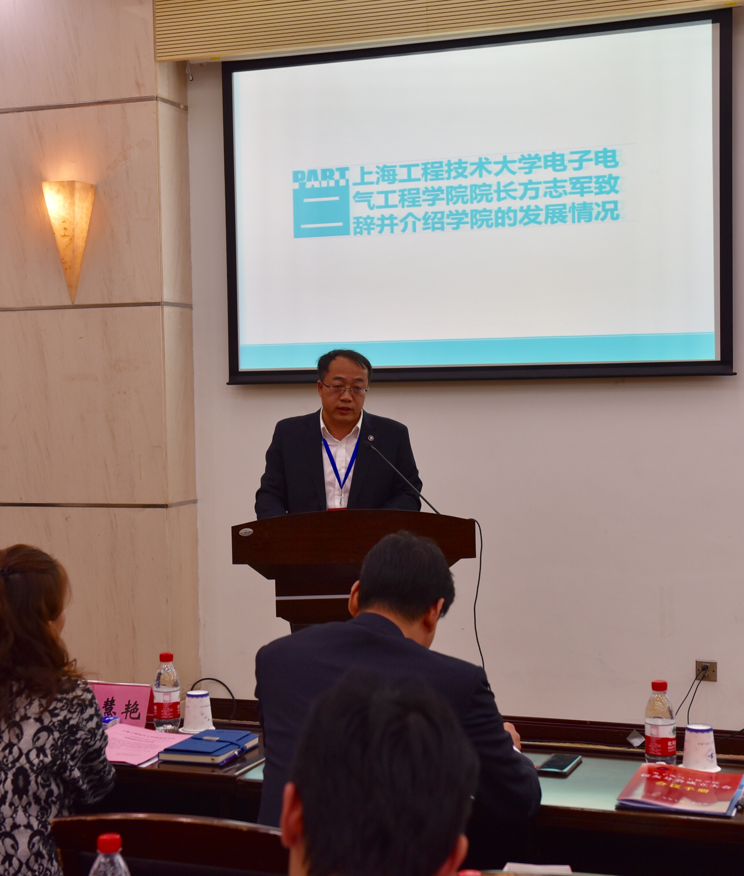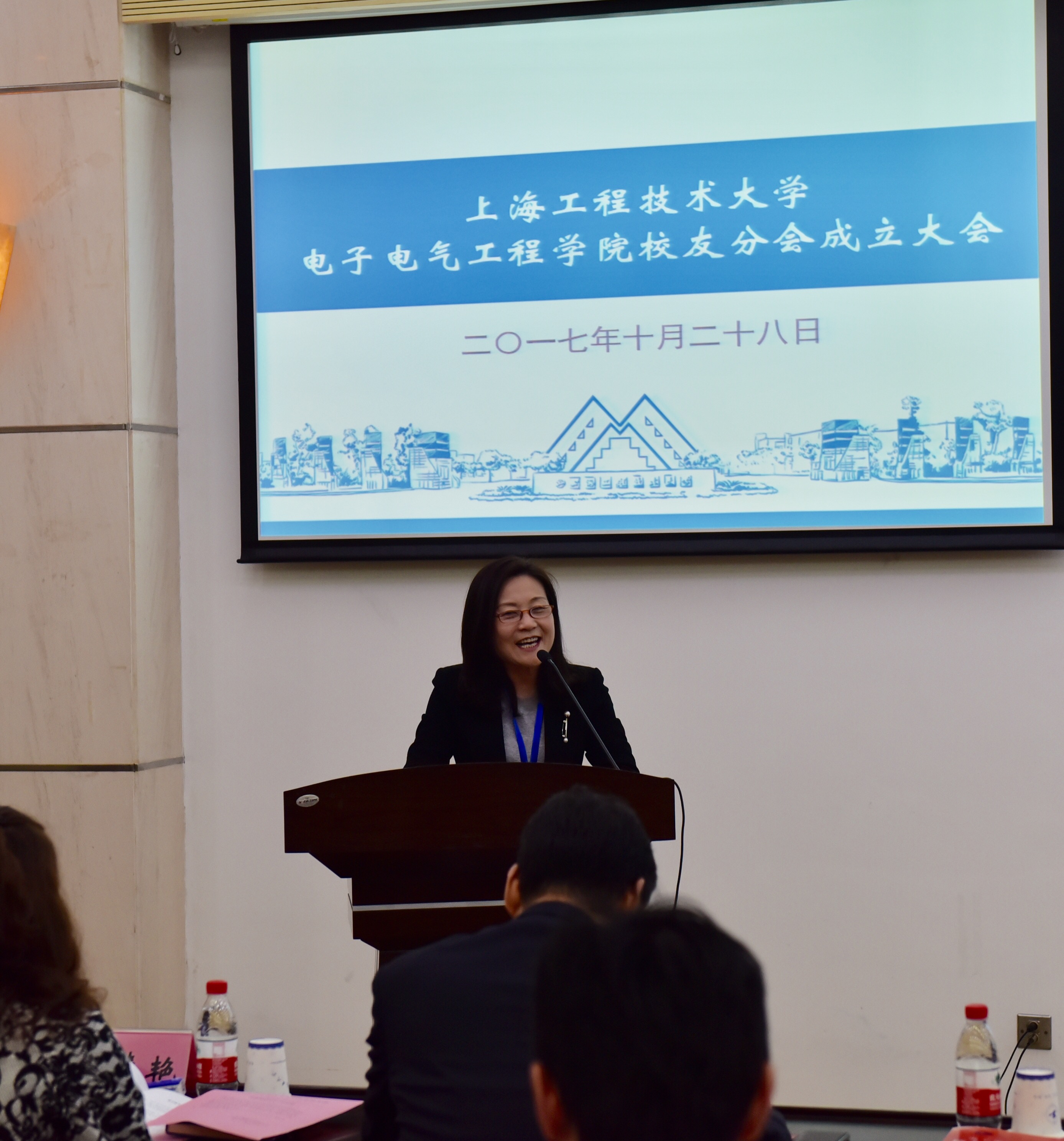 上海工程技术大学副校长姚秀平上台为成立大会致辞,致辞中姚校长对学院校友分会提出了三点要求和希望:进一步加强校友分会管理,规范工作制度;建立完备的信息网络,加强信息收集和利用;不断创新校友分会的活动载体,保持校友分会持续健康发展。他提到,电气学院校友分会的成立,让电气校友有了相互交流、沟通信息的平台,希望大家积极借助这个平台,相互帮助、共同进步,为母校的发展进一步建言献策,一如既往地关心和支持母校的建设与发展。