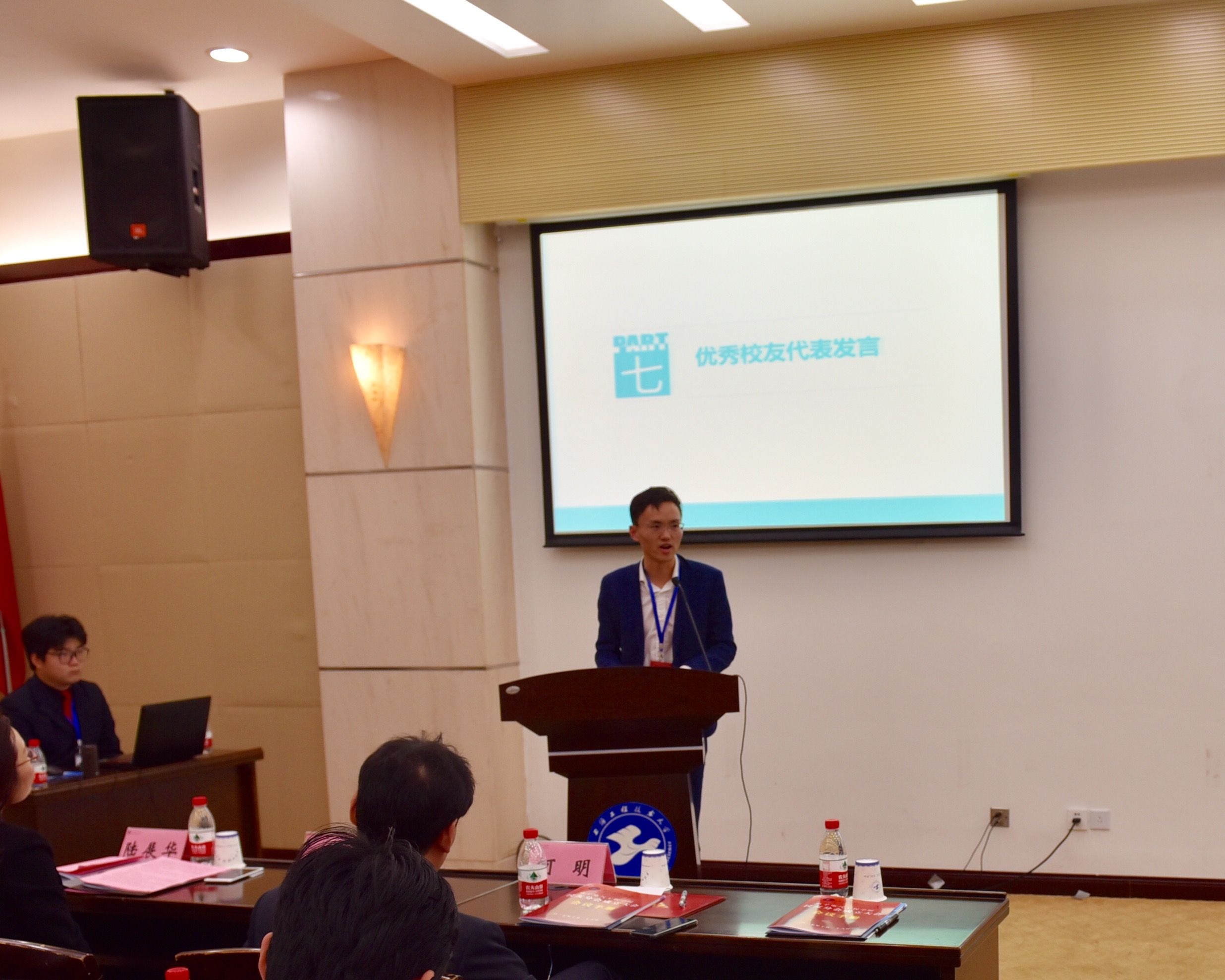 随后,我院2014届计算机科学与技术专业的校友,“淘洗洗”智能洗衣品牌创始人,松江区青年联合会第四届委员邓洋洋作为优秀校友代表上台致辞。他讲到:“在我创业出现困难的时候,学院的领导和老师为我主动提供各种帮助和便利,母校对我的关心增加了我继续前行的信心。” 他引用诗句“落其实者思其树,饮其流者怀其源”来表达自己的感恩之情,并强调自己将与各位校友一起,一如既往地关注母校的建设,支持母校的发展,用我们共同的行动和集体的力量回报恩师的哺育,回报母校的滋养。