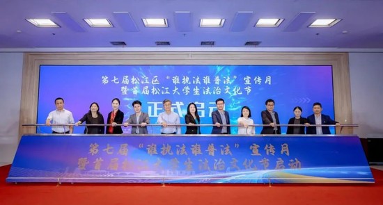 上海外国语大学、东华大学、华东政法大学、上海对外经贸大学、上海工程技术大学、上海视觉艺术学院、区司法局、区教育局和广富林街道领导,共同启动第七届松江区“谁执法谁普法”宣传月暨首届松江大学生法治文化节。