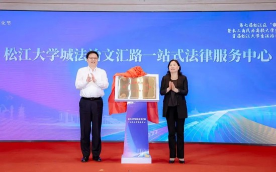 夏春明、潘琼共同为松江大学城法治文汇路一站式法律服务中心揭牌。该中心是由我校与松江区司法局、广富林街道、属地派出所、律所联合打造的“枫桥式经验”高校版,集法律咨询、法律援助、警务服务、法治的宣传等功能为一体,并辐射至松江大学城七所高校师生。