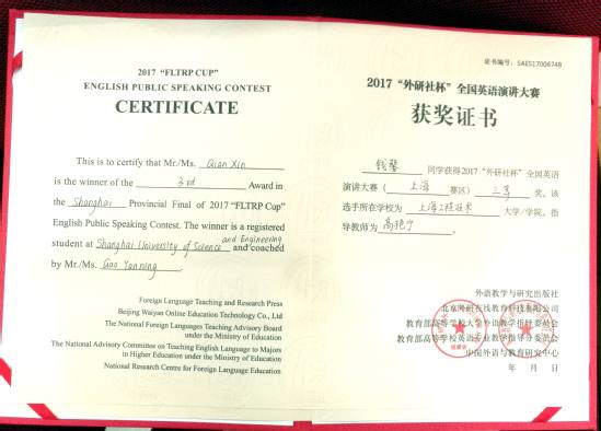 本次复赛吸引了来自复旦大学、华东师范大学、上海外国语大学、东华大学、华东理工大学、上海大学以及我校在内的25所高校的选手参赛。比赛分为定题演讲、即兴演讲、现场问答三个部分。比赛中,钱馨同学定题演讲题材新颖,即兴演讲理据充分有条不紊,现场问答机智应变对答如流,经过激烈的比拼最终获得了三等奖的好成绩。